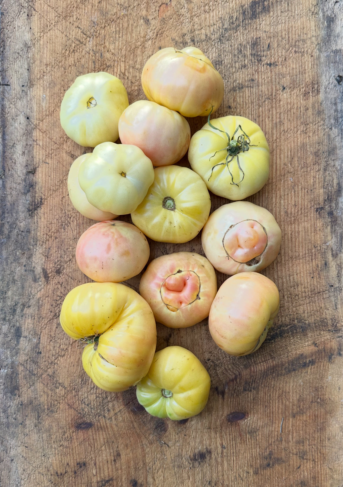 Etoile Blanche d’Anvers heirloom tomato seeds is a wonderful French heirloom tomato, which translates to White Star of Antwerp (hinting that it my have been borrowed from Belgium.) This is a medium sized tomato about 4” a bit flattened and slightly ruffled. The fruits are whitish yellow and can get a bit of pale pink on the blossom end. The flavor of the fruit is magical sweet and juicy. I love using it as a slicer even though it is a medium sized tomato.